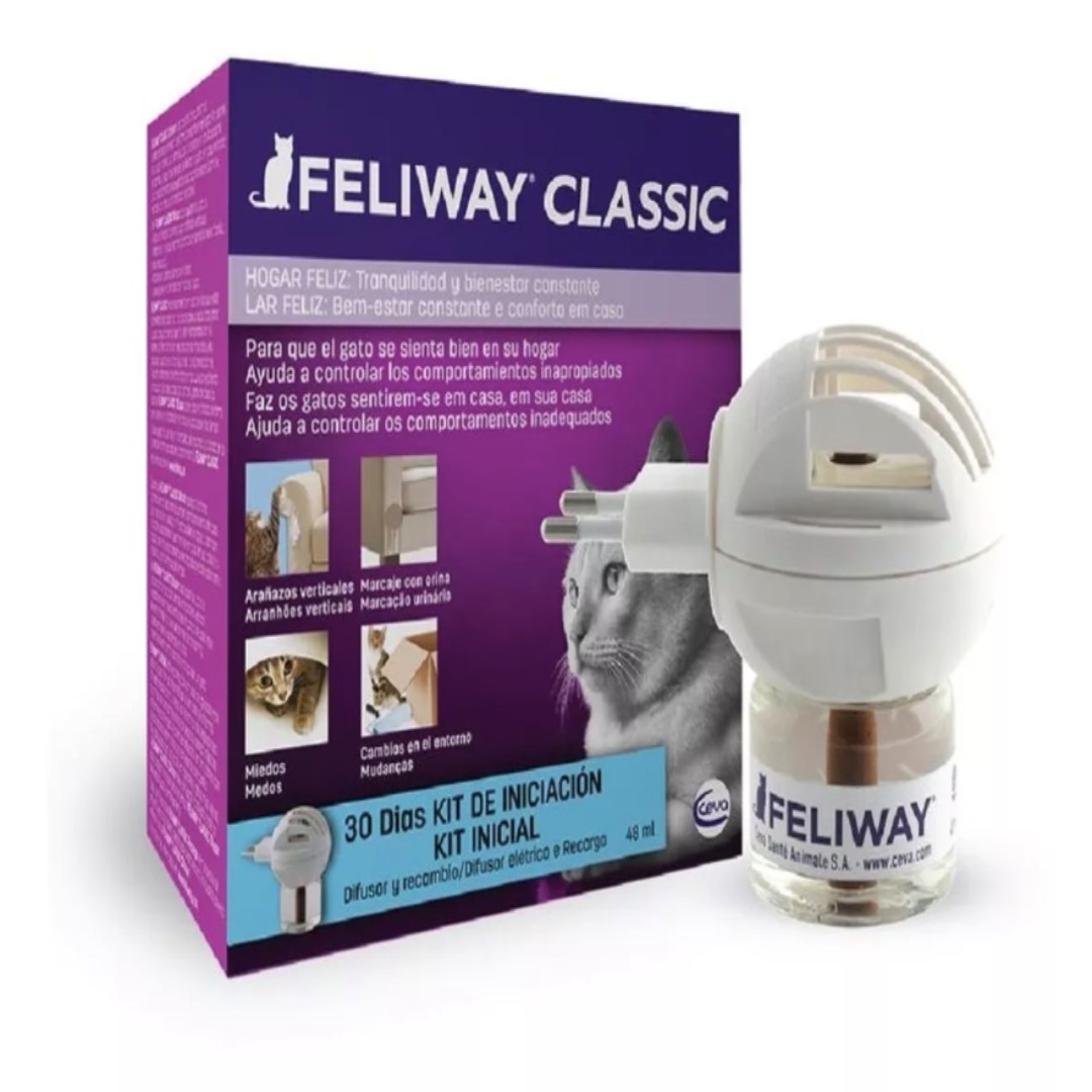 Feliway Classic calma a los gatos estresados y les hace sentirse bien en situaciones desconocidas, como la mudanza de muebles, el viaje en transportadora, la adquisición de objetos nuevos para la casa o entornos ruidosos y desconocidos. Feliway también ayuda a corregir el comportamiento agresivo de tu gato, así como la disminución de las ganas de jugar y de interactuar, el exceso de acicalamiento y la falta de apetito o la insaciabilidad. Esta feromona sintética brinda seguridad a tu gato para que las situaciones de estrés no desemboquen en estas conductas no deseadas.